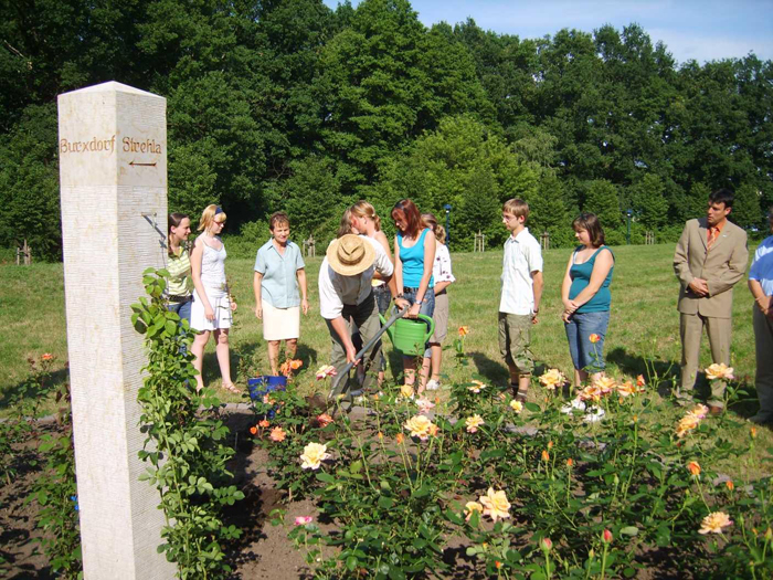 This might explain why the mayor of Bad Liebenwerda, the Honourable Thomas Richter, did not only personally provide for the funds to get the rights for the new Polowsky peace rose, but also invited Torgau's mayor, the Honourable Andrea Staude, to take part in the rose naming event. Together, with her, he unveiled a new stele with three inscriptions, STREHLA - BURXDORF - TORGAU, which is in the centre of a rose bed with varieties from Russia, USA and Germany. Young students from the Bad Liebenwerda "Elsterschloß Gymnasium" together with local nursery specialist, Roland Graeff, planted the Joe Polowsky Rose around the stele.